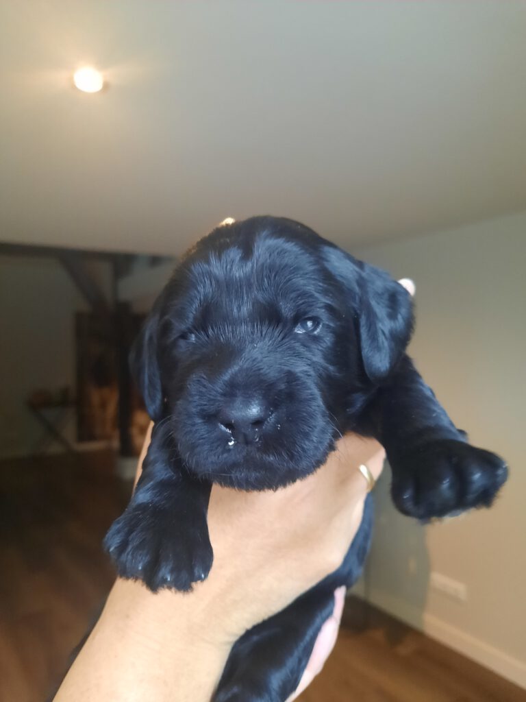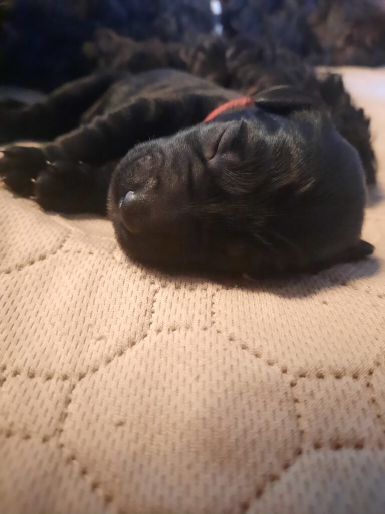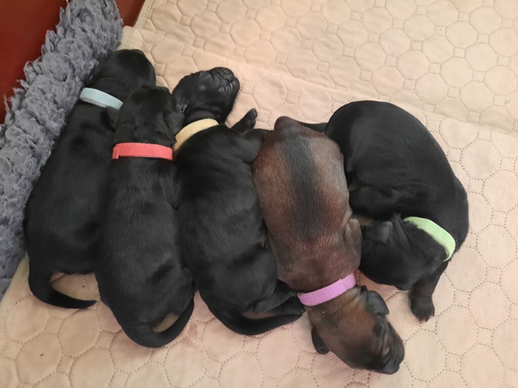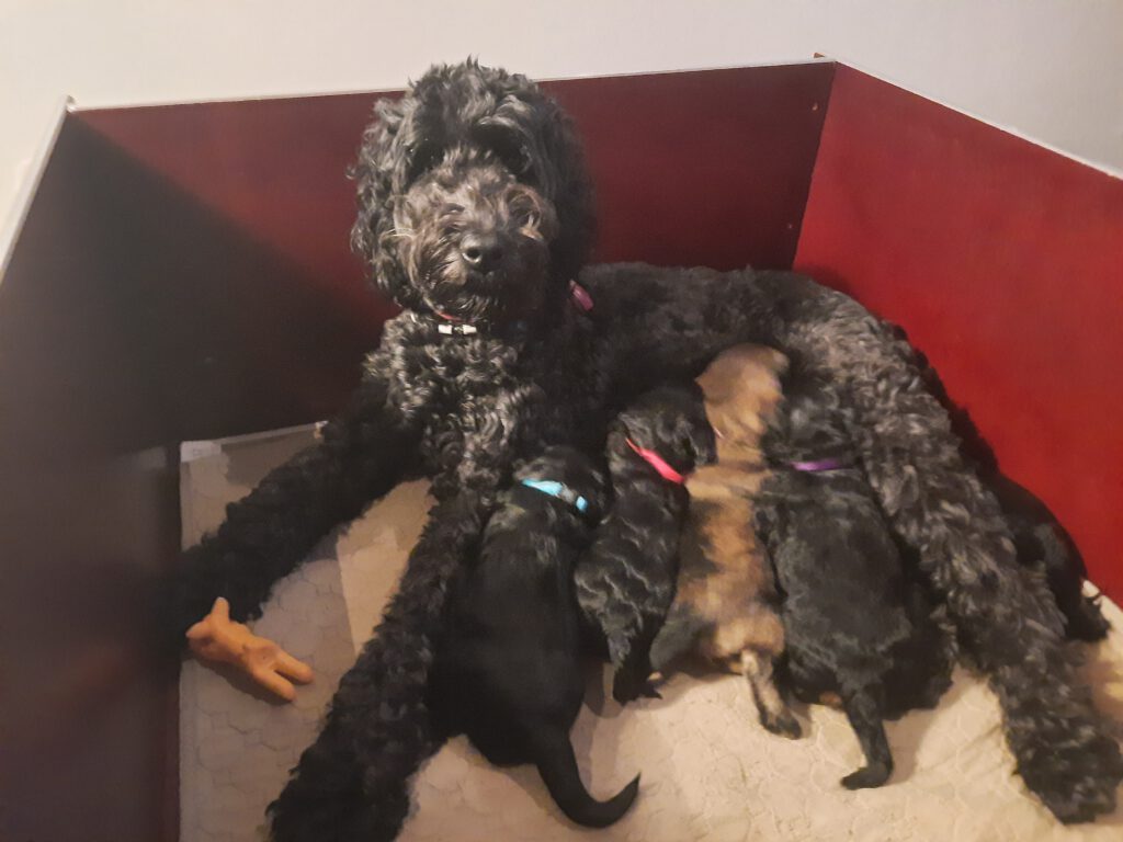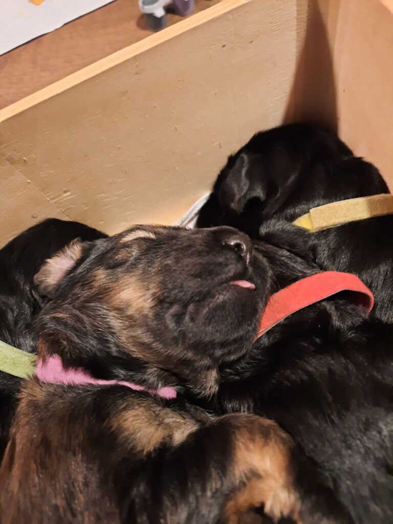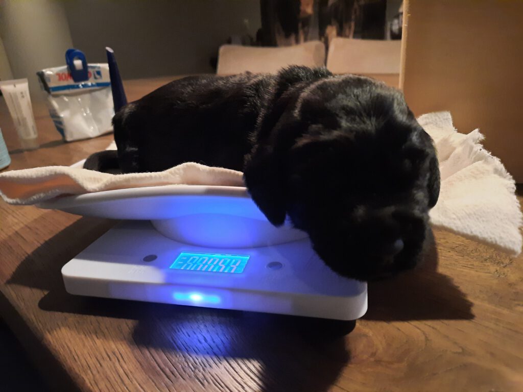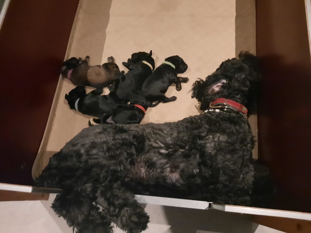 10:25 begonnen en 13:05 klaar met 5 zwarte en 3 blonde pupjes. Alles goed gegaan! Trots.